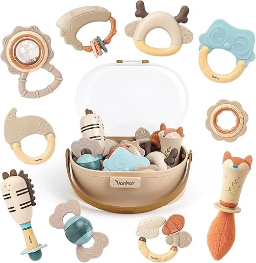 Baby Teething Toy: Rattle toys for babies 0-6 months set with 10 pieces of different shaped rattles as well as rattles. Comes with a storage box for neat storage. Food-grade silicone teether relieves swollen gums during teething, and the different texture rattles stimulate sensory exploration, one-stop to meet your baby's developmental needs.