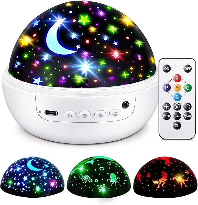 5 based colors (red/blue/green/yellow/purple)+many mix.B aby sensory toys for babies sensory lights meet all yr need.Plug in night light for kids sensory lights' 360° Rotation+Timer(1-2-4-8h) made baby night light kids awesome sleep helper!Smart remote+star projector night light kids own buttons make it easy to use!
